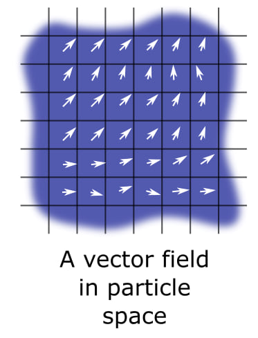 The output of the fragment of code above is the data variable that essentially is a discretized velocity field in particle space; i.e., each cell in particle space is mapped to a horizontal velocity (+X is right) and a vertical velocity (+Y is down), also in particle space.