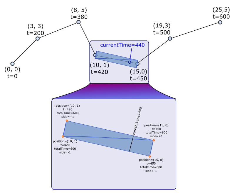 It does so by taking advantage that each fragment is associated with a timestamp, computed automatically by the GPU interpolator based on the timestamps at the two closest vertices.