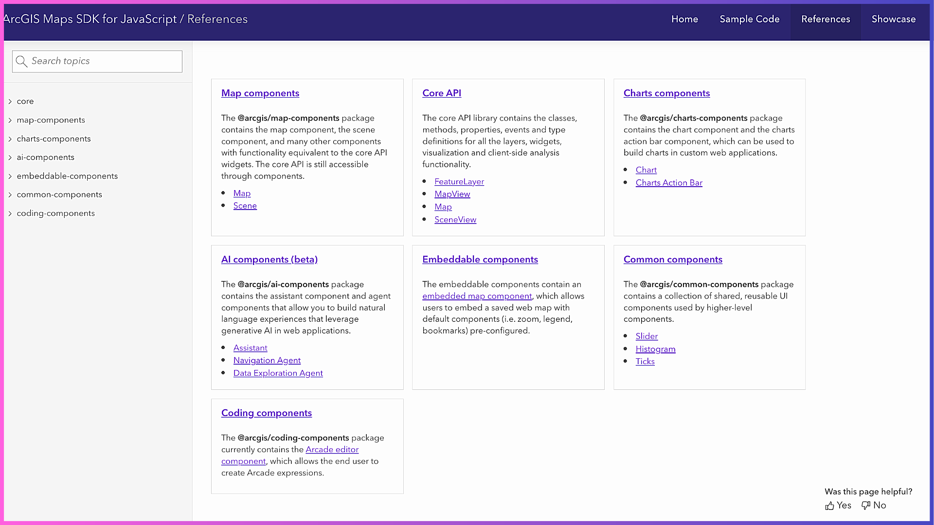The SDK also includes standards-based web components built using the core API. They are reusable and can be used to incorporate maps, charts, UI elements, and AI into web mapping applications with minimal code. These components are designed to work with plain JavaScript as well as modern frameworks such as React, Angular, and Vue.