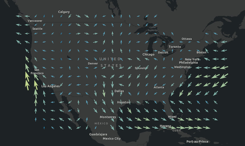 Using the new VectorFieldRenderer class, you can symbolize raster data using vector symbols. This is often used for visualizing flow direction and magnitude in meteorology and oceanography raster data. The direction of the raster defines the angles, while the magnitude of the raster defines the size of the symbol.