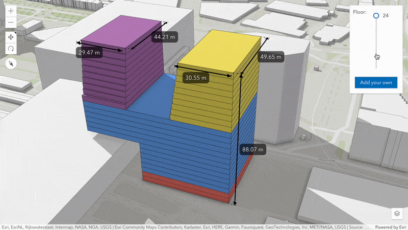 A new capability called dimensioning allows you to display length or distance measurements between two points in a 3D scene. This can be done programmatically – for example if you want to show measurements of geometries from another layer – or by allowing the user to interactively manipulate the dimensions associated with a layer. Users can easily dimension existing features through 3D snapping. The dimensions are represented in a new layer type called DimensionLayer which will be included in the legend and layer list widgets just as any other layer and can be saved to and loaded from a WebScene. The dimensions can be used in slides to share with stakeholders, such as for existing and proposed developments.