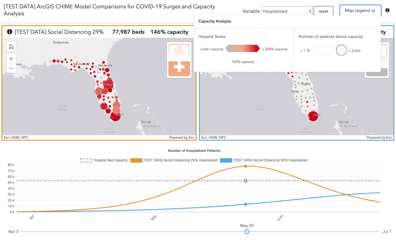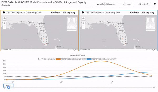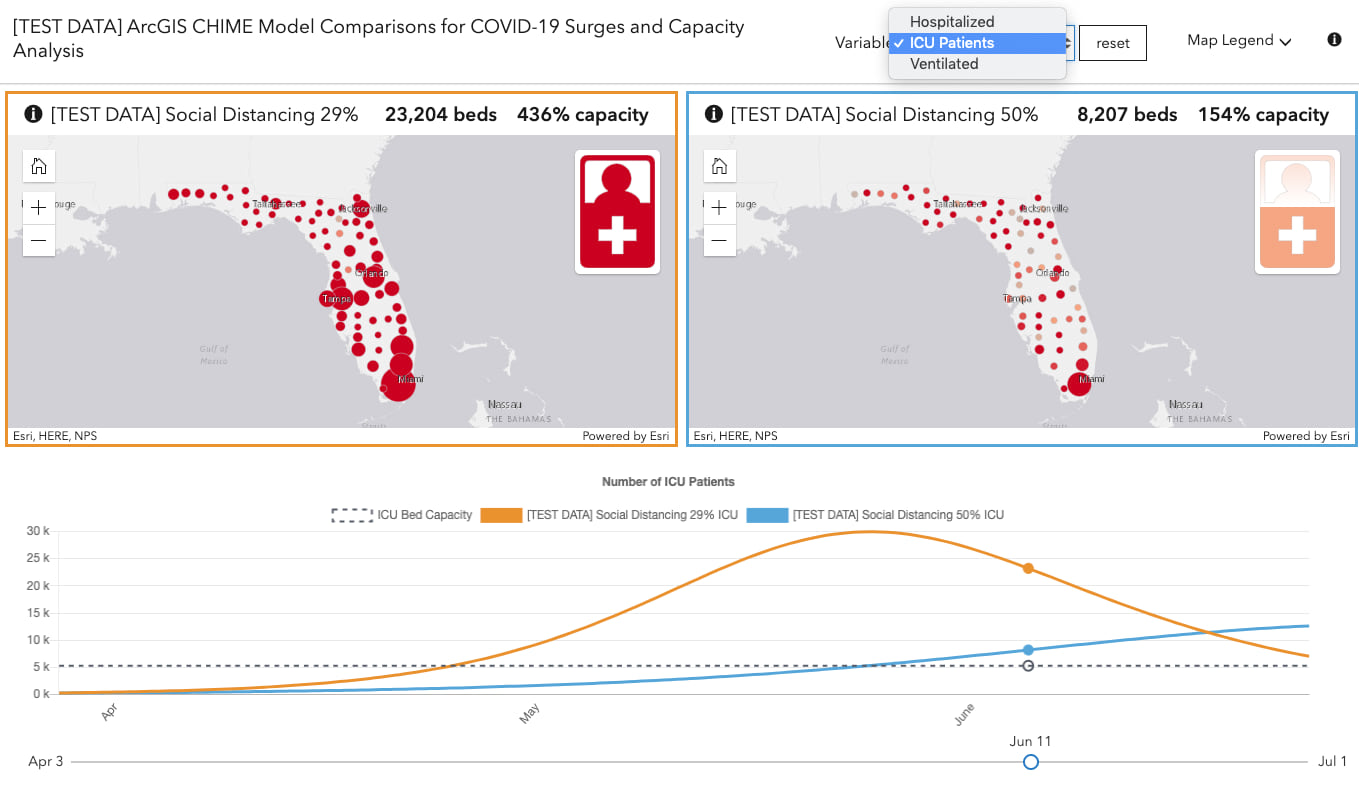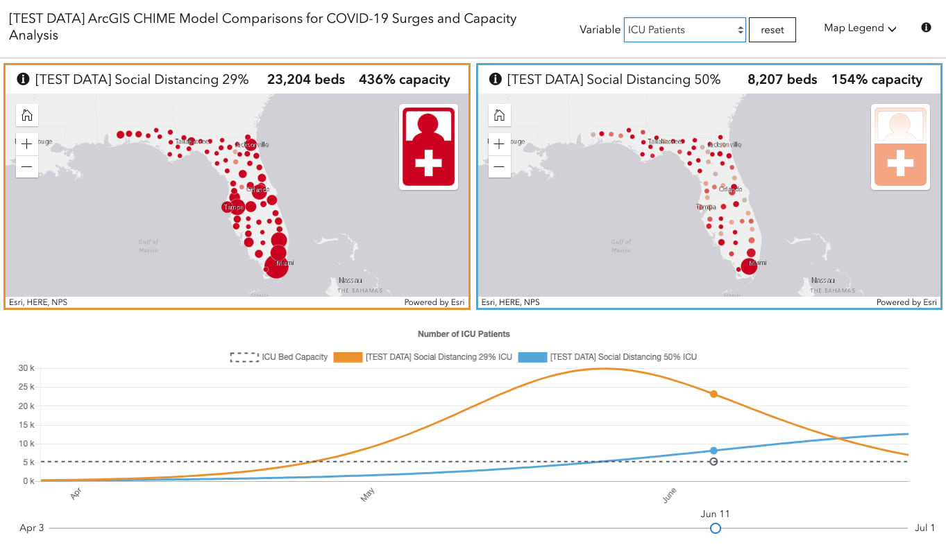 This makes it easy to compare two different scenarios. For example, the map on the left (orange line on the chart) shows how many ICU beds would be required on June 11 in Florida (this is test data) if 29% of the population follows social distancing recommendations. The map on the right (blue line in the chart) shows the required ICU beds by geography if 55% of the population observed social distancing.