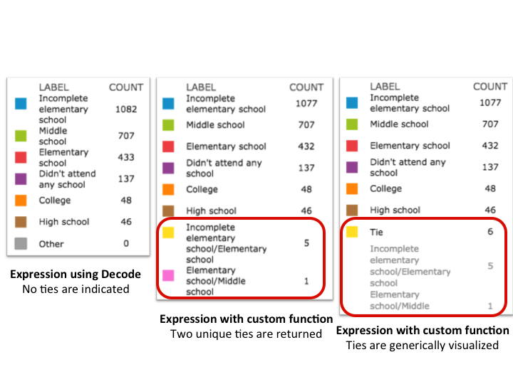 However, one user at our presentation asked a great question: “What if there’s a tie for the top category?” The answer we gave is that Decode will return the first match in the case of duplicate winners. While ties are relatively common in the datasets I’ve looked at, very few of them involved the max value. Nevertheless, the Decode approach is flawed and doesn’t address the real question: “How do we visualize ties for the top category?”