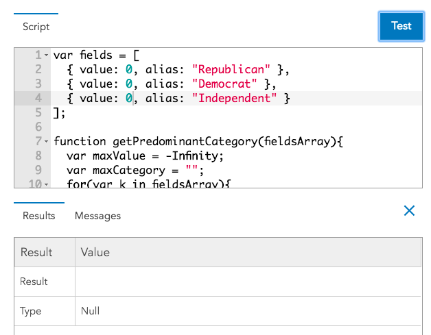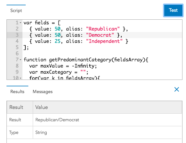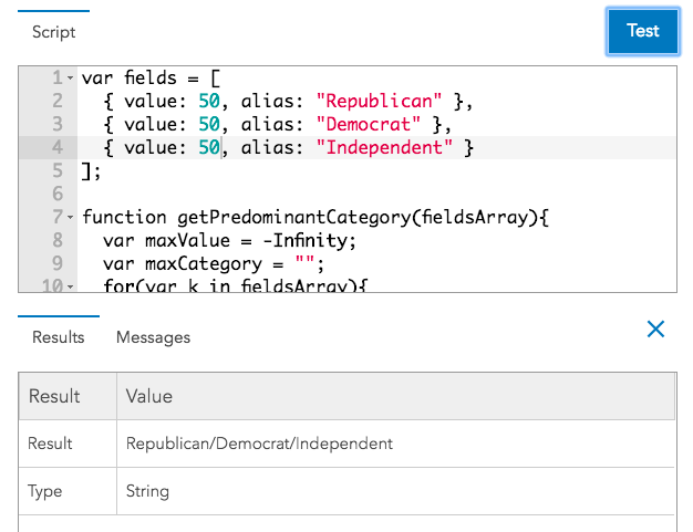 Let’s take a look at how well this approach works using the Arcade playground. I entered dummy field values representing the number of votes cast for three political parties in a fictitious feature and ran the expression. It correctly returned the maximum value.