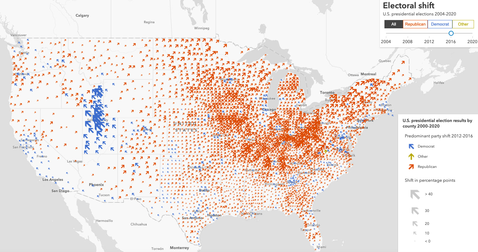This map displays an arrow for each county representing the party with the largest positive change in votes as a percentage of the turnout from the previous election. Arrow color and direction indicate either a predominant Republican, Democrat or third-party shift in percentage points. The arrows are CIMSymbols (scaleable, customizable, vector markers). The type of arrow and its size is determined by Arcade expressions.