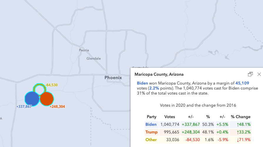 As you zoom in, you can view patterns on the county level. While there were increases in both Democrat and Republican votes in every county, Maricopa County reported the most votes, where Biden won by a margin of 2.2 percent of the vote.