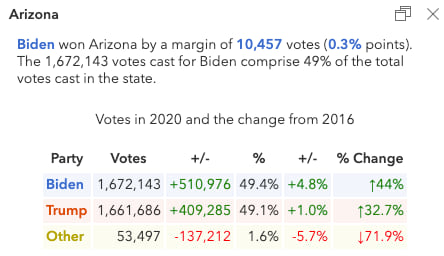 Biden won Arizona by only 10,457 votes. The popup below shows both Democrats and Republicans had significant increases in turnout. Ultimately, Biden out-performed Clinton in 2016 by nearly 5 percentage points, which was enough to propel him to win Arizona’s electoral votes.