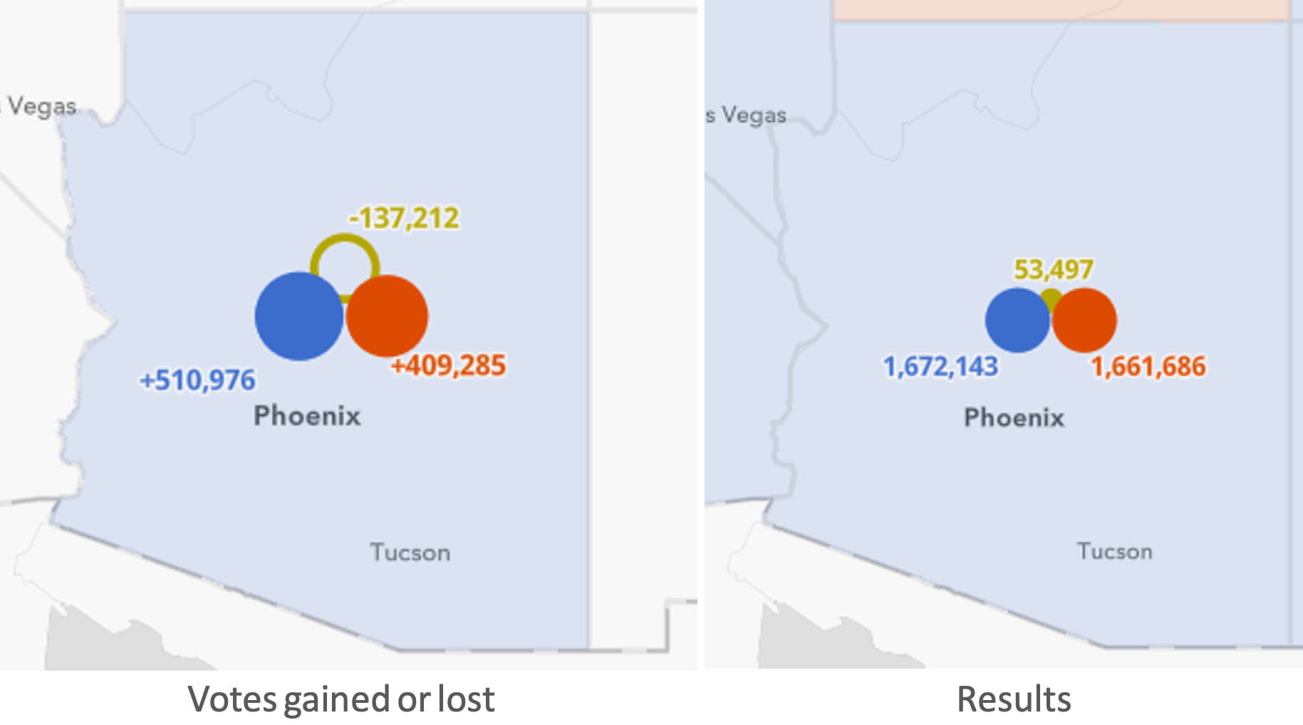 County symbol sizes are normalized by the total state vote. This indicates which counties individually are more influential in determining how a state allocates its electoral votes. In the following image, Maricopa County is more prominent since it contributes more votes than any other county in Arizona.