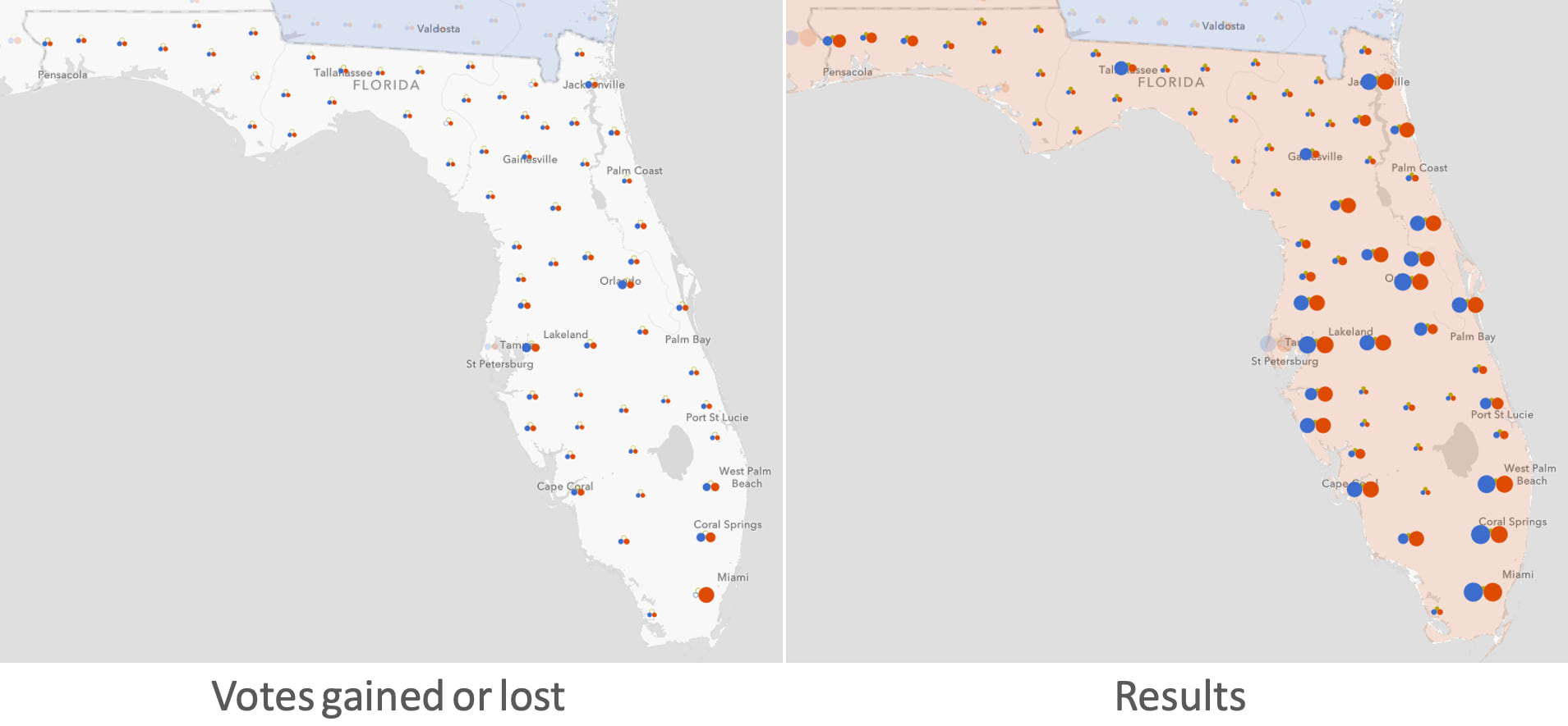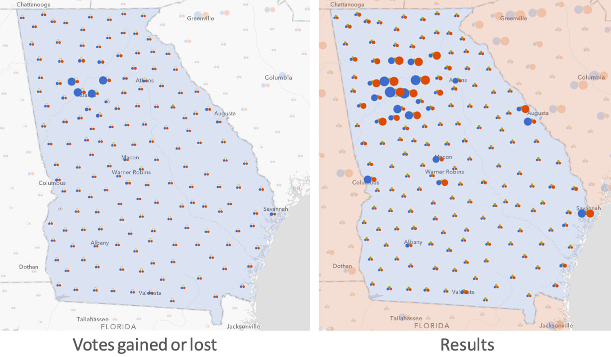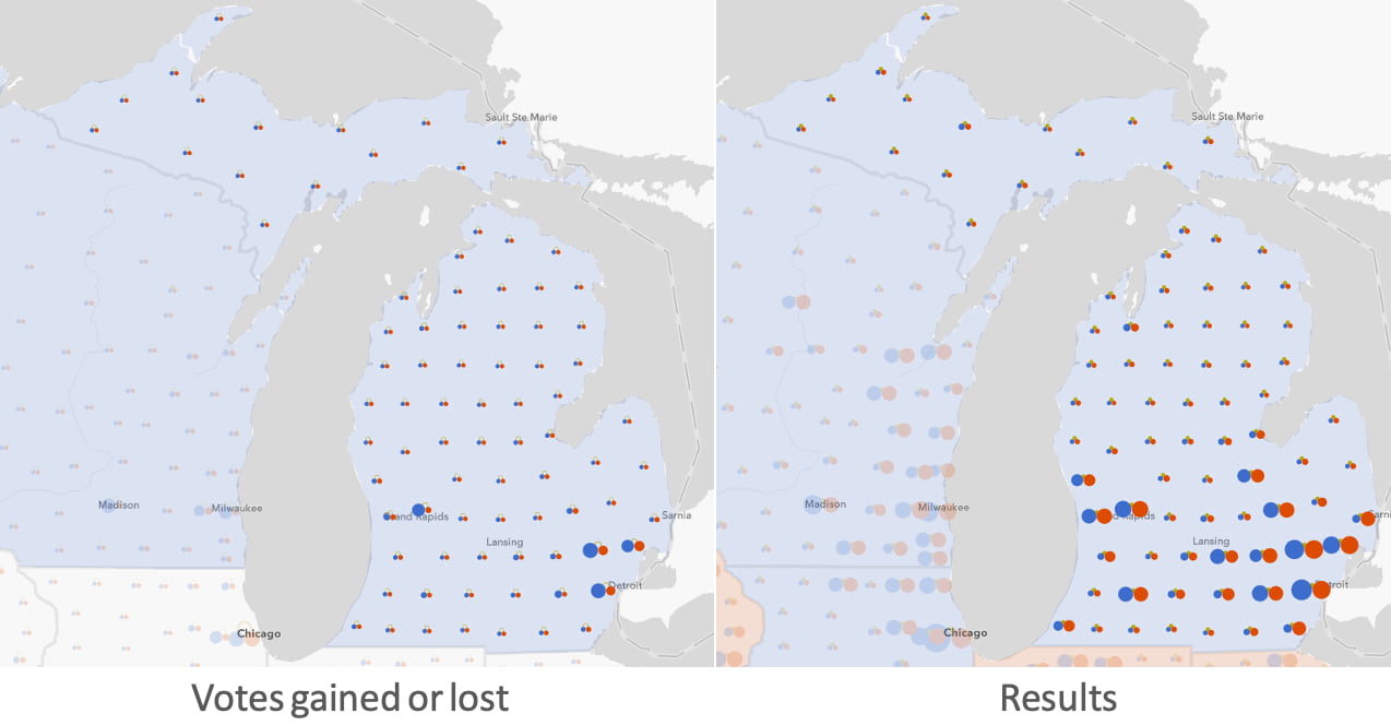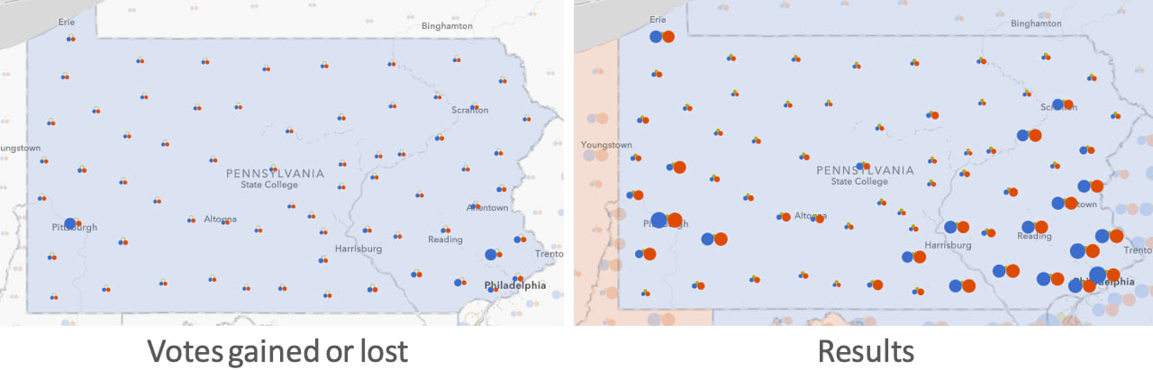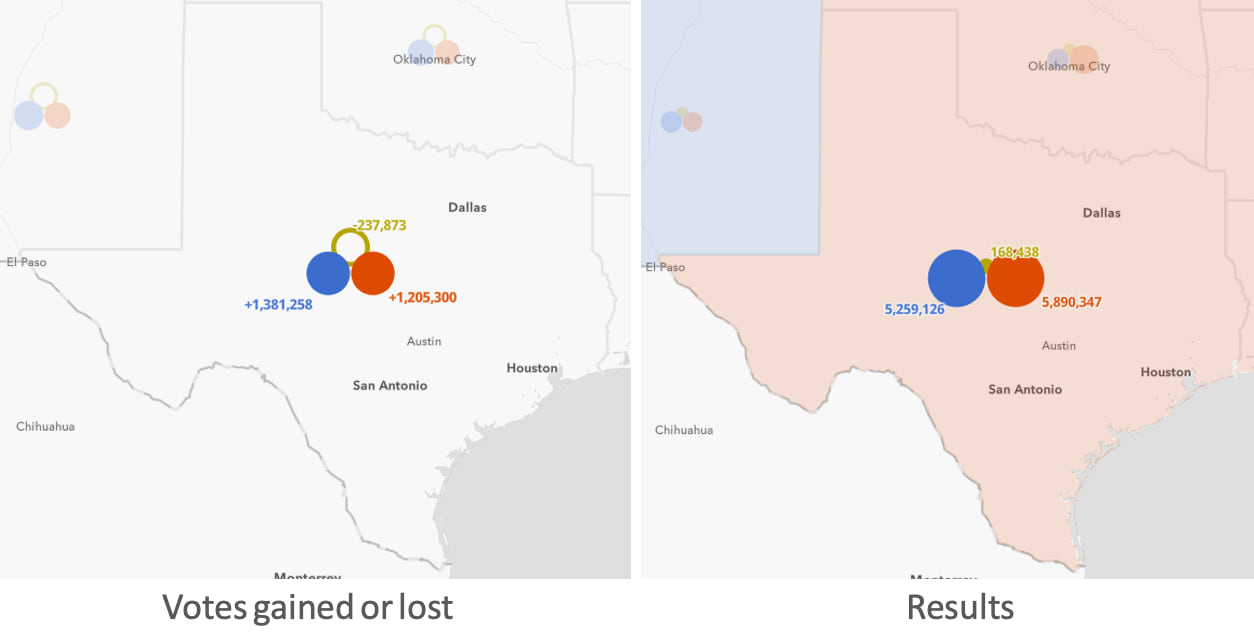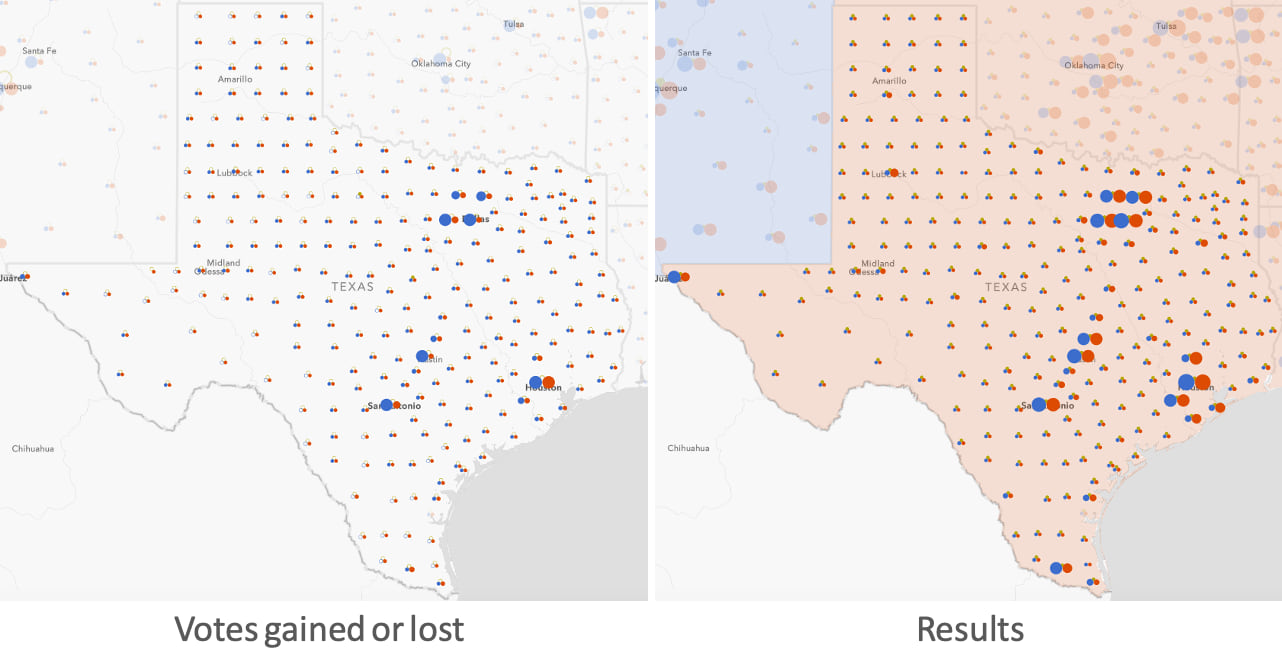 In a single view, you can see whether each party shifted positive or negative in the state or county level. Hollow circles indicate where a party lost votes. Solid circles communicate where a party gained votes.