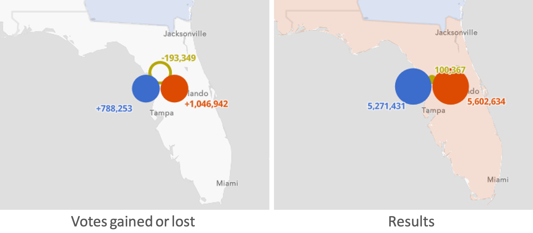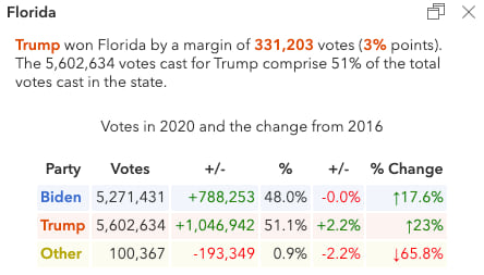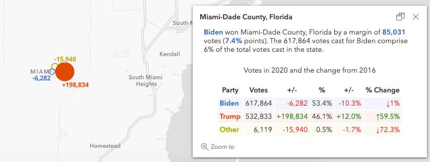 Use the Swipe widget to view how the change in votes compares to the result. For example, Biden significantly underperformed in Miami-Dade County, Florida, even though he earned the most votes in the county.