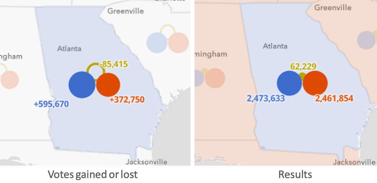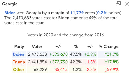 Biden won Georgia by a similar margin as his victory in Arizona – only by 0.2 percentage points. The popup below shows nearly 600,000 more voters voted Democrat than in 2016, enough to improve the Democratic candidate’s share of the votes by nearly 4 percent.