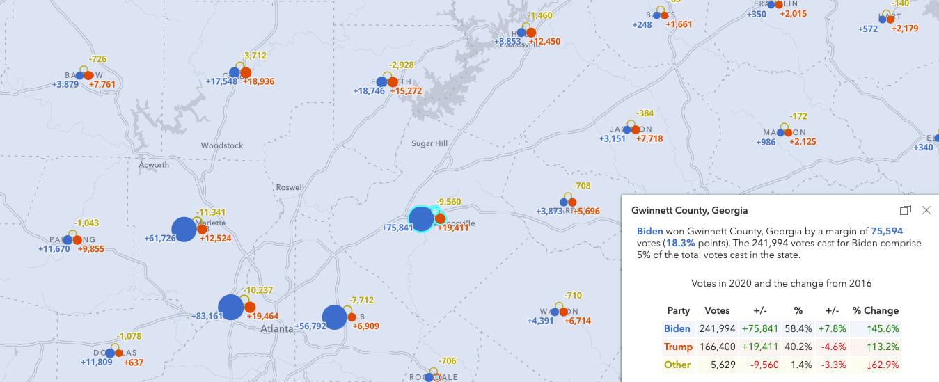 As you zoom in, you can view patterns on the county level. While turnout increased for both parties in nearly every county, Fulton County (Atlanta) and its neighbors saw more significant increases in Democratic votes. In Gwinnett County, for example, Biden gained nearly 8 percent of the vote from 2016 (+75,000 votes). Trump lost 4.6 percent of his votes in 2016 despite him gaining nearly 20,000 votes overall.