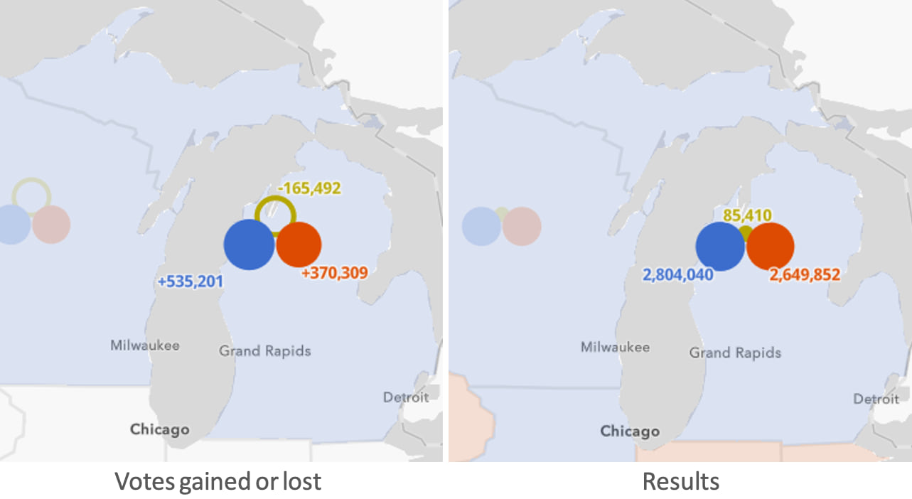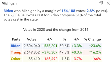 Biden won Michigan by a margin of nearly 3 percentage points. The popup below shows Biden added 3.3 percent of the state’s votes to the 2016 Democratic share.