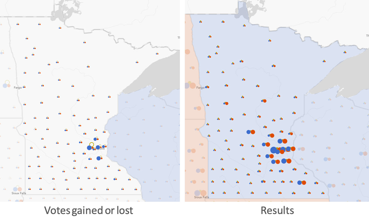 As you zoom in, you can view patterns on the county level. The counties in the Twin Cities area contributed the most to securing a strong Biden victory in the state.
