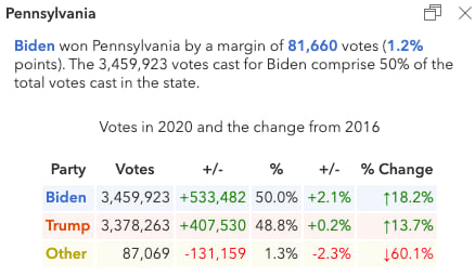 Biden won Pennsylvania by a more comfortable margin of 81,660 votes (1.2 percentage points). The popup below shows both Democrats and Republicans improved their share of the votes from 2016.