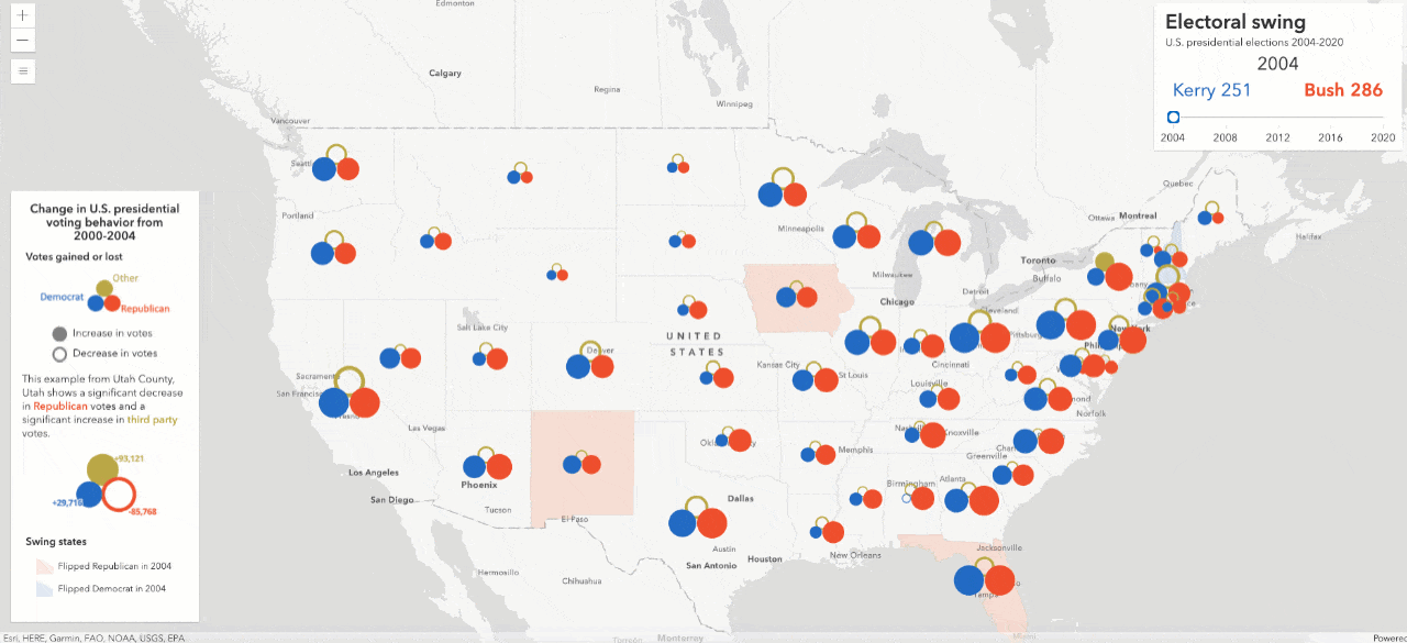 In the weeks leading up to the 2020 U.S. presidential election, I introduced a map style that visualizes electoral swing using data-driven multi-part symbols in the ArcGIS API for JavaScript (JS API). I recently updated the app to use data from the 2020 election. I also added a slider, allowing you to explore all presidential elections from 2004-2020. Click the image below to open the app and explore the data.