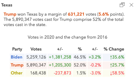 Some polls showed Texas being a very close race, yet Trump still won the state by more than 600,000 votes (a margin of 5.6 percent). Despite the win not being that close, Biden still out-gained Trump, improving his share of the vote by 3.2 percentage points. Trump’s 5.6 percent margin of victory in Texas is narrower than any other winner in Texas since 1996.