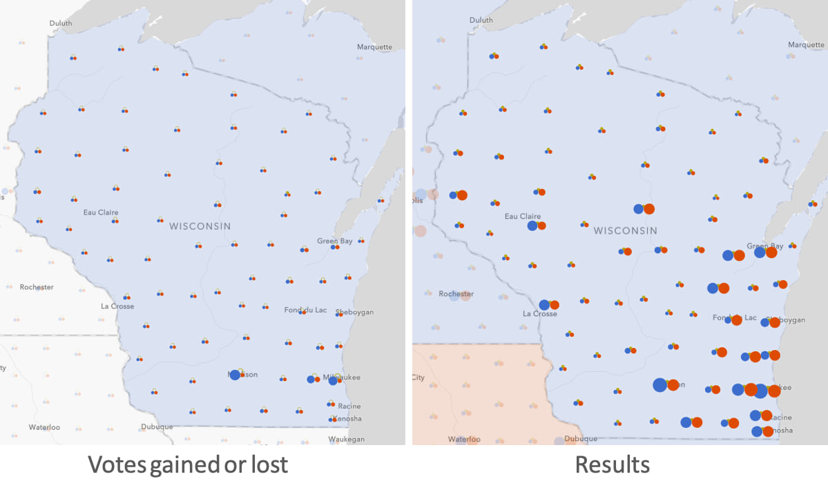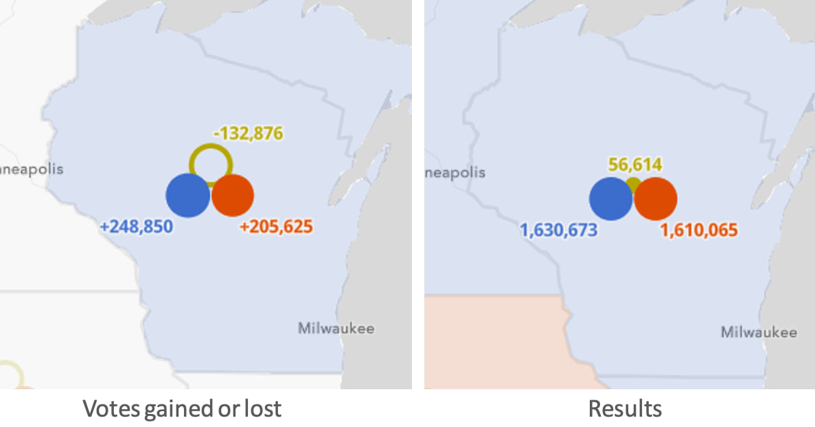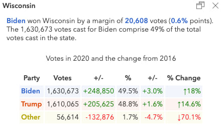 Biden won Wisconsin in 2020 by a slightly smaller margin than Trump did in 2016, only 20,000 votes.