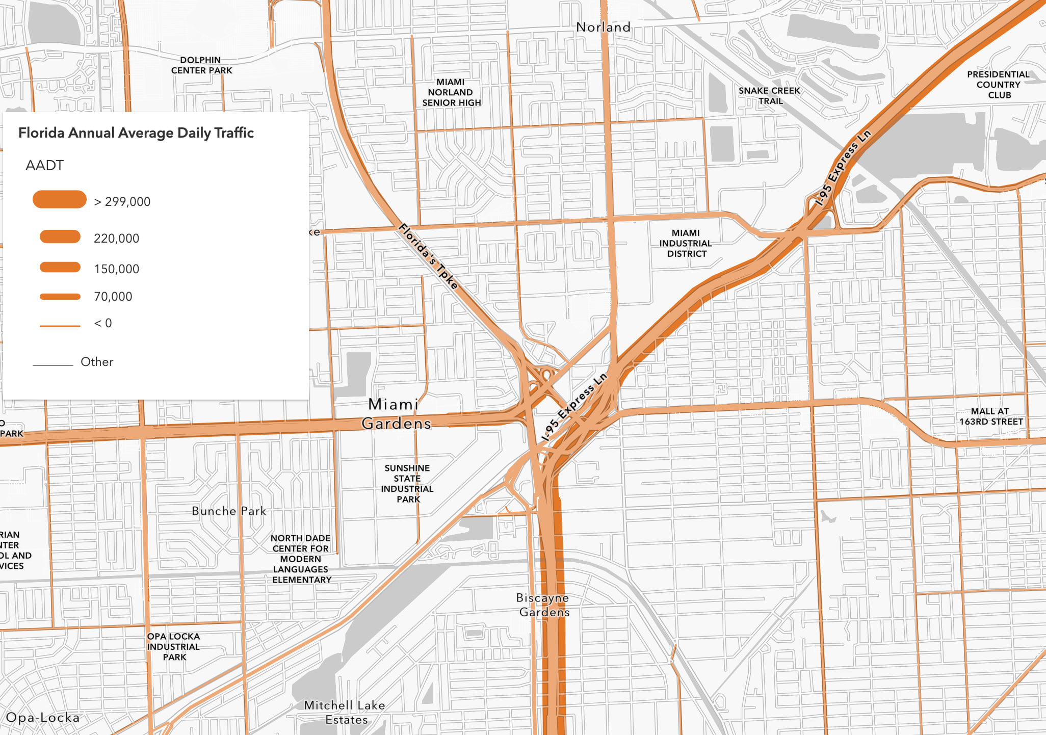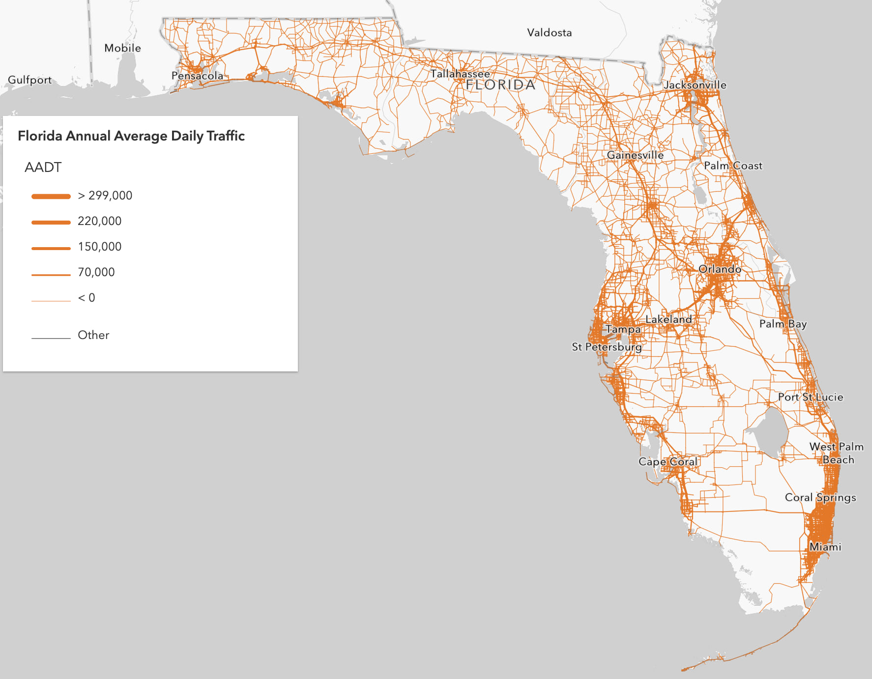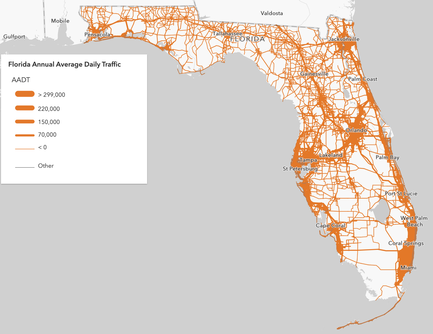 We’ll use this example of traffic count data in a polyline layer of Florida highways, though this principle can also be applied to point layers and polygon centroids.