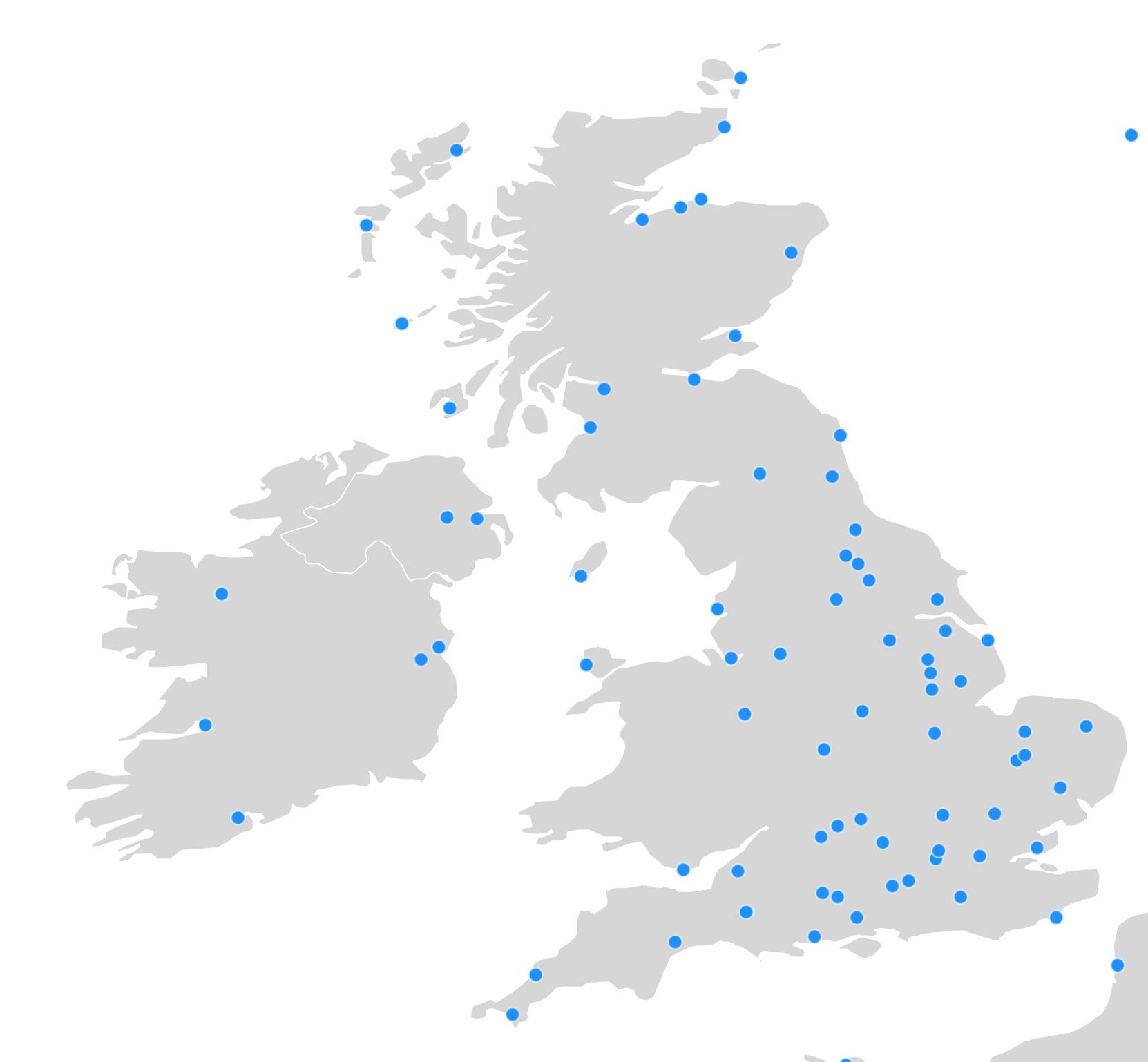 One icon size usually doesn’t look good at all scales. This is especially true for dense layers. For example, the points in the map below look good with a size of 10px at a national scale.