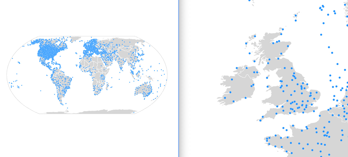 But when zoomed out to a worldwide extent, 10px appears too big. The large icon size obscures the underlying data, potentially misrepresenting its density.