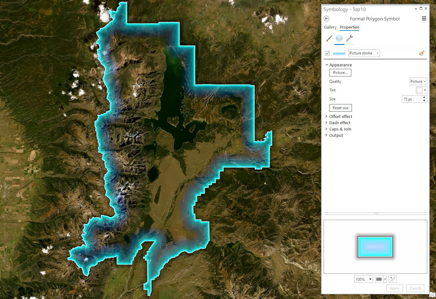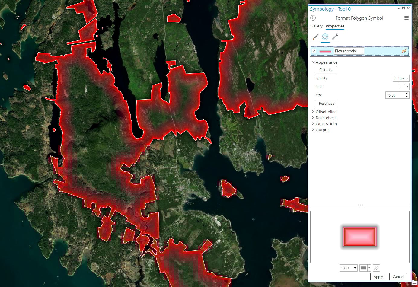 So you want a super slick inner glow effect for some polygons in your app, to no avail. Sure, an “inner glow” effect isn’t yet supported in the JavaScript API, nor is a buffer fill. But Picture strokes are supported, and you can bake all manner of visual shenanigans into those things…