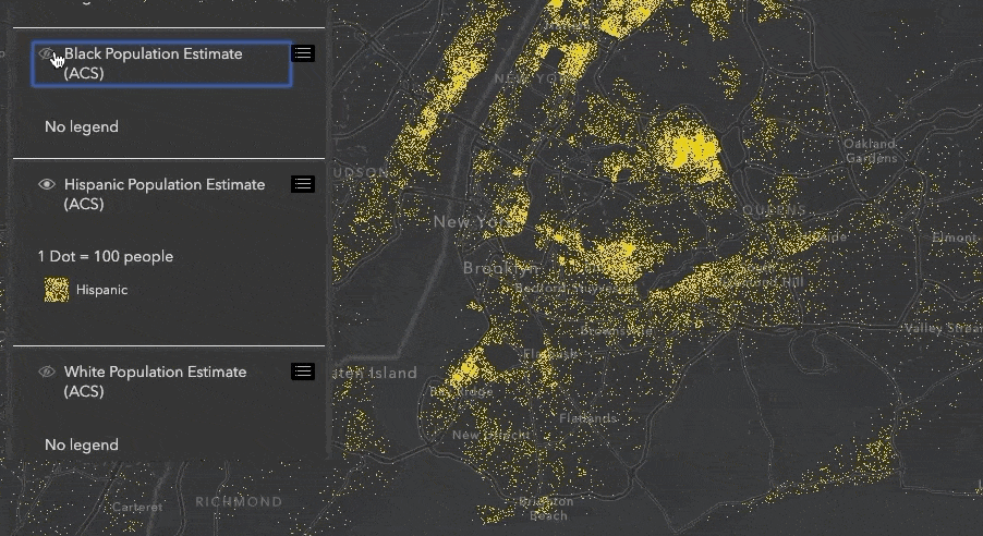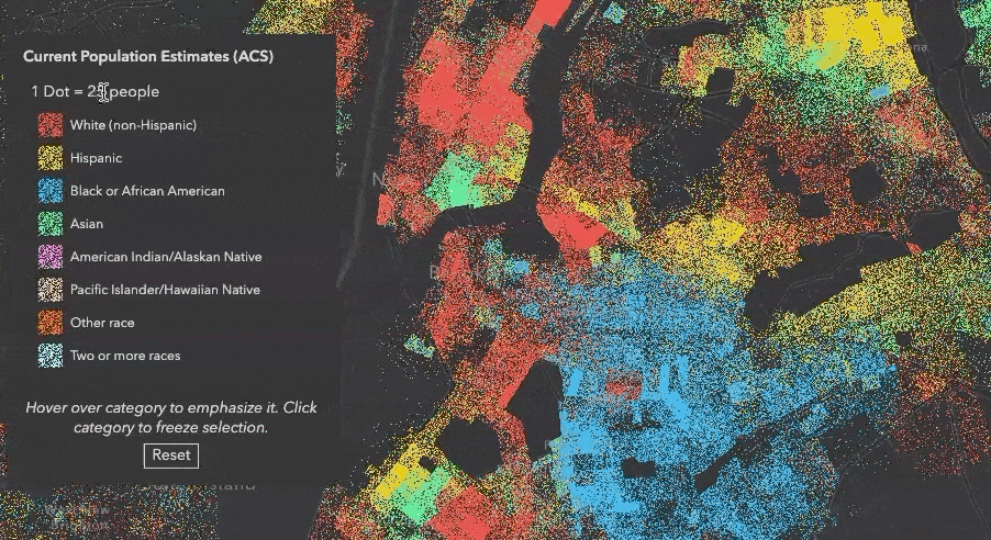 As you can see, with just a little bit of customization, you can create highly interactive dot density visualizations for data exploration purposes. This is just one way you can do that. Stay tuned for more posts exploring dot density in the ArcGIS JS API.