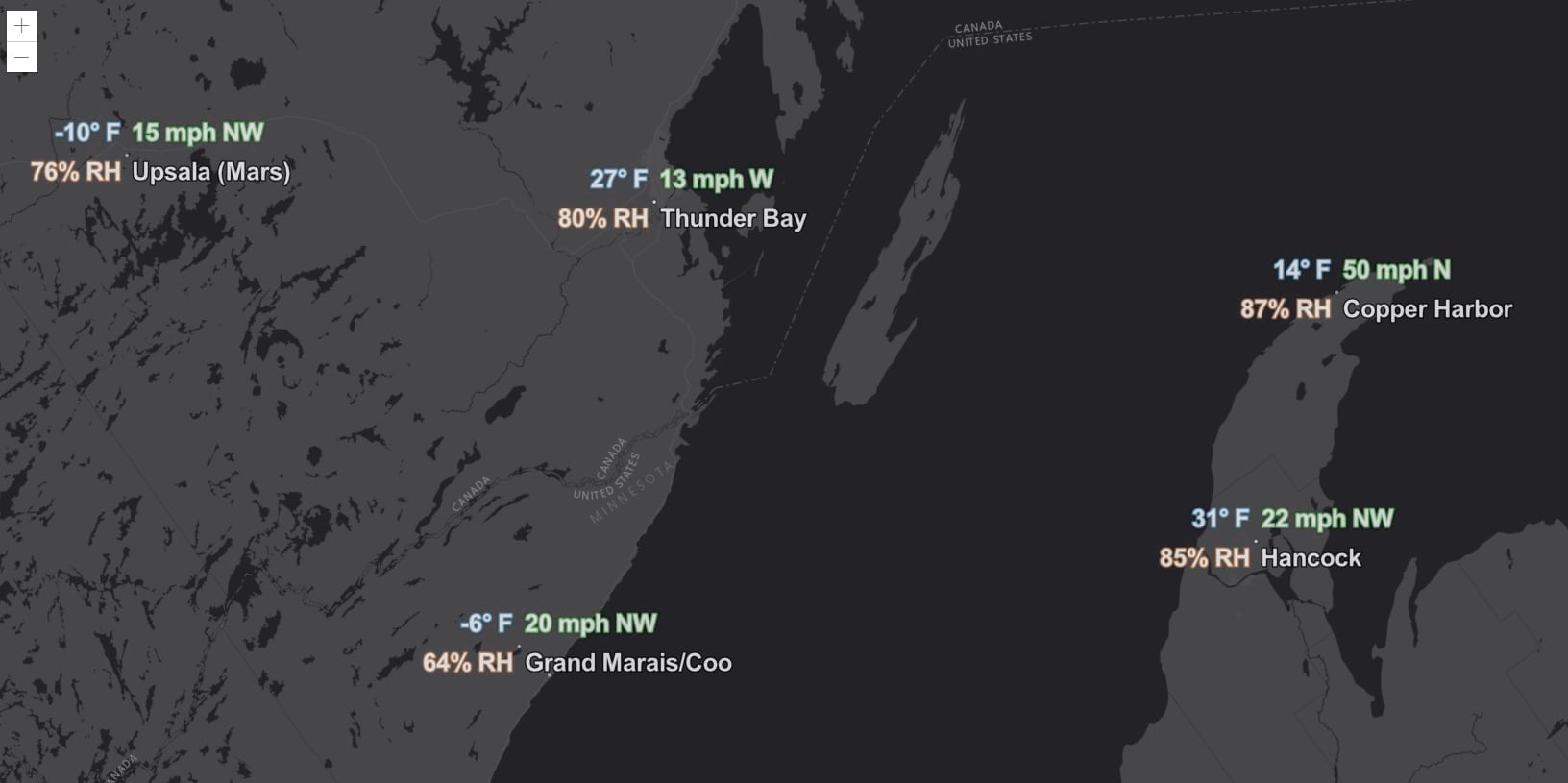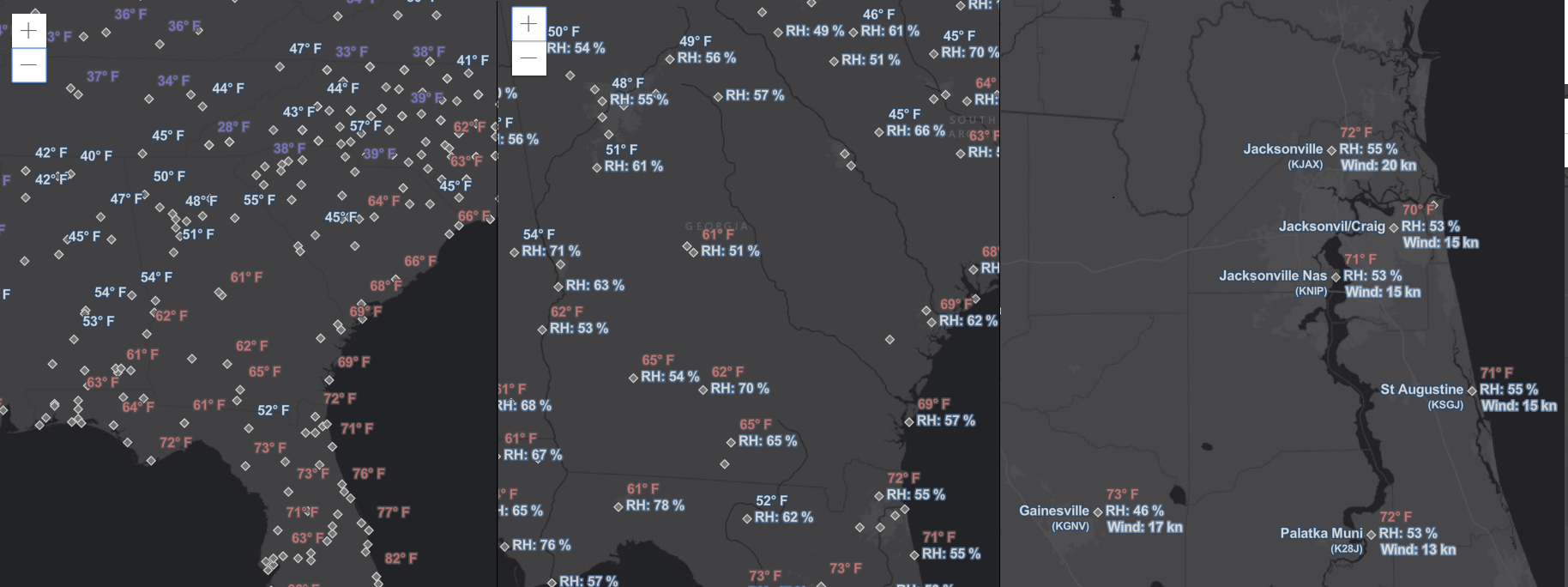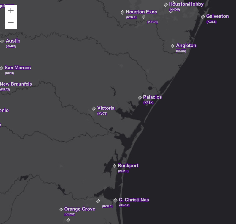 We prepared an app that displays two labels for each feature; notice how the name of a weather station appears to the right of the marker ("center-right" placement) while the 4-letters ICAO code is displayed just below ("below-right" placement).