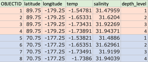 - This introduced a new problem – Now the layer has 1,224 fields, or 102 fields for each variable for each depth level (e.g. temp_1, temp_2, temp_3, etc. ). In other words, the temperature at depth level 1, depth level 2, etc. at each location.