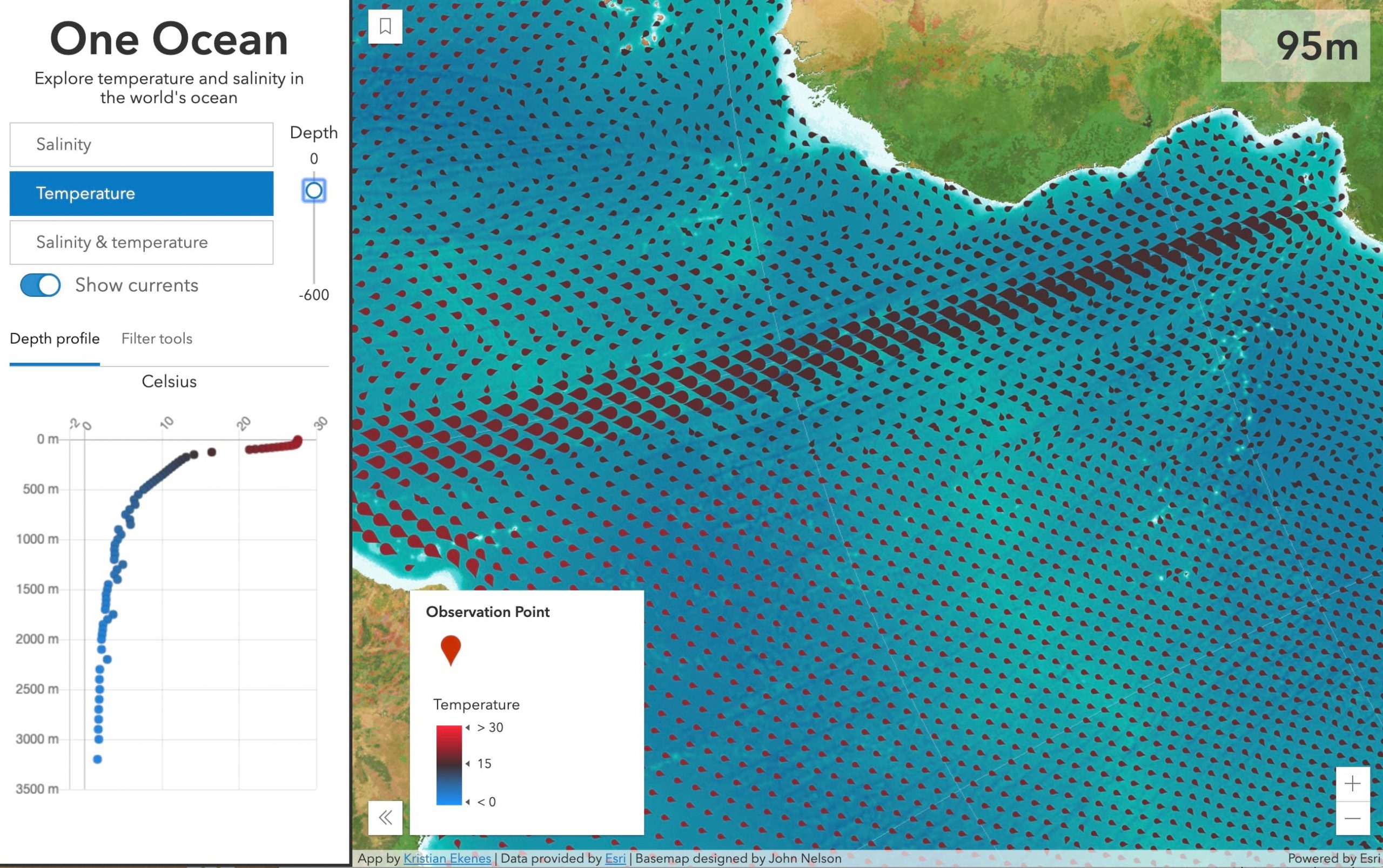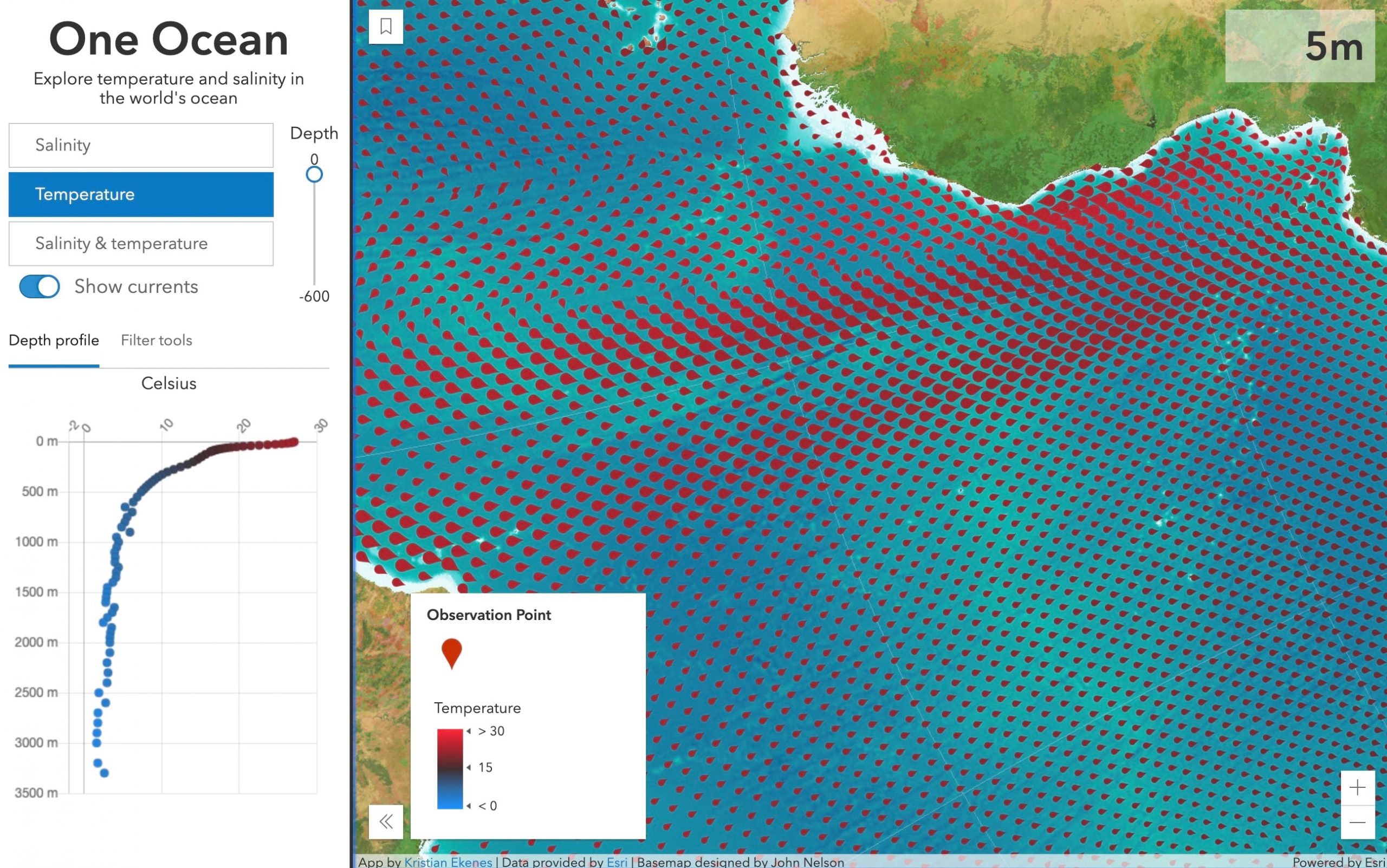 Then the ArcGIS JS API takes over and quickly makes the update so we can see how temperature, salinity, current speed, and current direction change for each location at various depths of the world’s ocean.