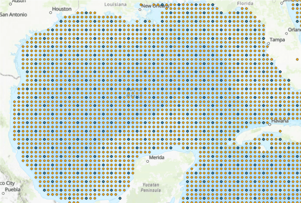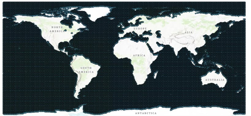 While the table pivot significantly reduced the number of points, 677,000 features is still too many for a global extent. Knowing each point was ¼ degree apart, we experimented with thinning points to every ½ degree.