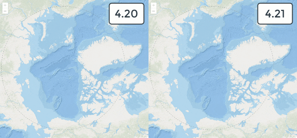 For polygons with a large number of vertices, layer draw time has significantly improved. Behind the scenes, we added a new simplification algorithm to preprocess the geometries to optimize memory management. We’ve migrated our triangulation code to WebAssembly, which has significantly sped up the time needed to process these types of features. These improvements are specific to complex polygons, and have led to an improved draw time for these polygon features. In this example below, the Artic sea ice layer loads over 5x faster than the same layer in version 4.20.