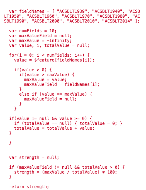 We can turn the housing visualization into a more interactive data exploration visualization by allowing the user to specify which fields will be used in the predominance calculation. This allows you to compare various decades for housing booms or even see the movement of housing growth from inner cities to suburbs over time. Click the image below to view the app.
