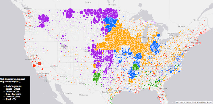 This map visualizes the predominant crop of each U.S. county. Icon size indicates total crop yield.