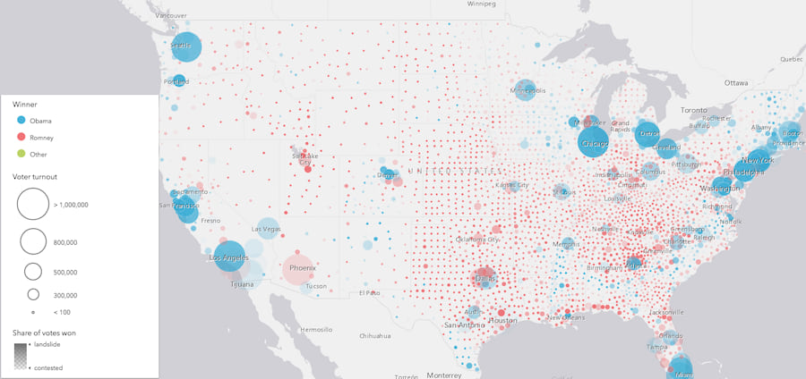 Size is used to visualize the total sum of the competing categories. This provides context to how the feature compares to the dataset as a whole. For example, in an election map, if a candidate wins a particular geographic area in a landslide, the opacity will show the strength of the win. But the size will indicate how much that win matters compared to other features. See the image below. While individual counties in the midwest voted overwhelmingly for the Republican candidate, each feature individually doesn’t account for many votes compared to areas with much higher populations.