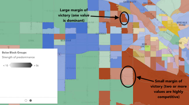 Visualizing predominance involves coloring a layer’s features based on which attribute among a set of competing numeric attributes wins or beats the others in total count. Common applications of this include visualizing election results, survey results, and demographic majorities.