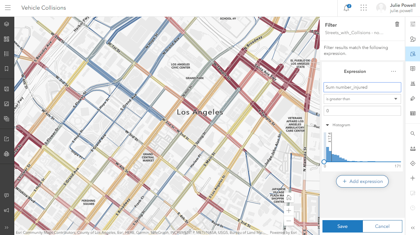 Map viewer / Immediate feedback and interactive filtering help you explore the data on the map and find the data you are interested in. Statistics about the field are also displayed, such as the count of the records, sum, minimum, maximum, average. While authoring your filter, the map is updated to display where your data matches your filter and where it doesn’t by visually de-emphasizing features that are outside your current filter.