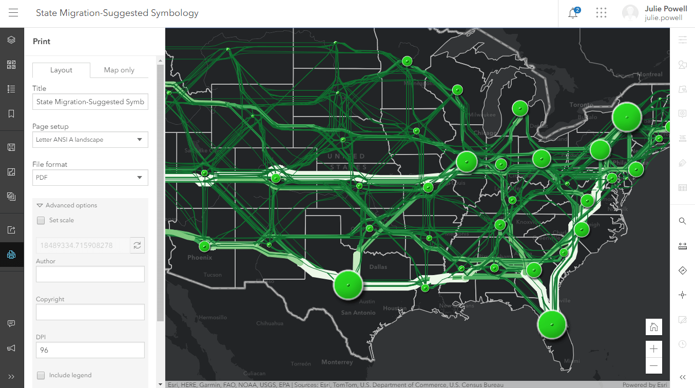 Map viewer / The map viewer saves your cartography work of art in the form of a web map. The web map is a configuration of layers, style information, pop-ups, view state such as initial extent, and more. The power of the web map is that it can be defined once using a simple authoring experience, and it is consistently displayed in all ArcGIS clients with little effort.