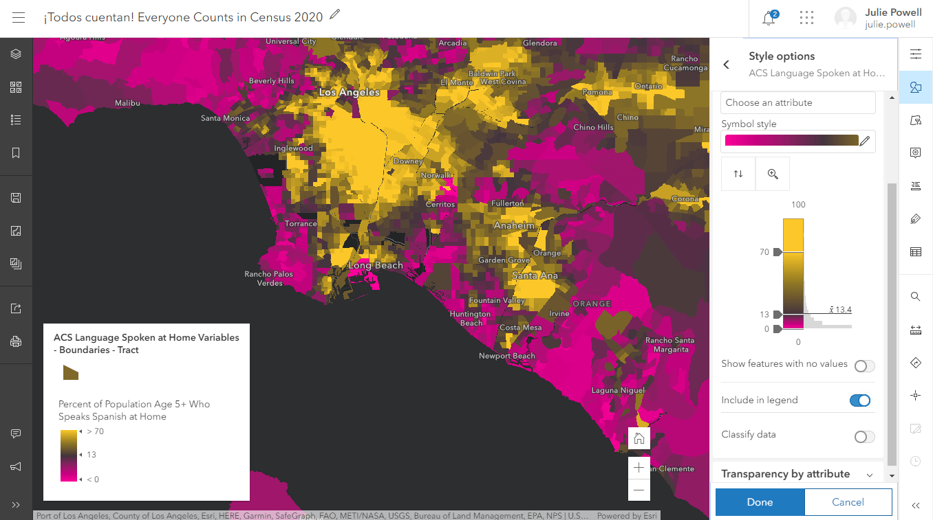 In your app / The API exposes the Smart Mapping API that the map viewer uses under the hood. Using this functionality, you can create map exploration tools in your app. For example, you might want to give your end users the ability to select from a list of attributes to thematically map like in this dot density visualization. When they select an attribute, the smart mapping tools can automatically select a style that works well with the data and the basemap.
