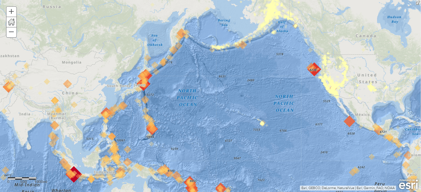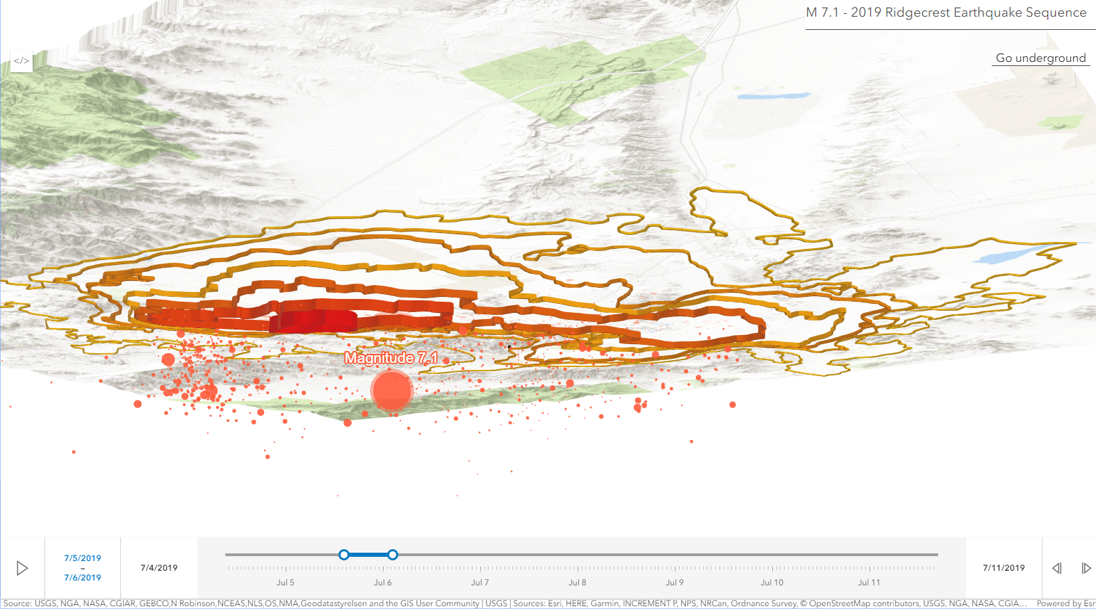 For example, the US Geological Survey earthquake feed includes elevation information that provides the distance below the earth’s surface. You can use the elevation information to set the depth of each feature and interact with the data underground in a 3D scene. Take it a step further and use the magnitude of the earthquake to drive the size and color of the features. Looking at the visualization below, you can really get a sense of the movement going on below the surface, even if you didn’t feel the shaking.