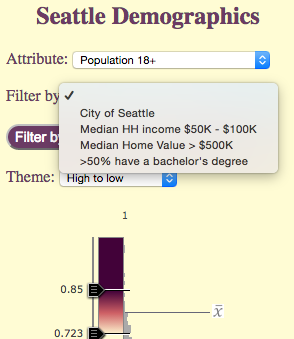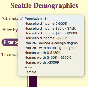 In the Seattle app, the service representing demographic data by block group contains more than 60 attributes. My users only care about a few of those attributes. So rather than providing an option to select any field, I chose to restrict the user to selecting one of 12 attributes. In this case, I only care about home value, household income, education attainment, and adult population. So I don’t bother providing the user with the 50 other attributes they would otherwise have to sift through when choosing a new attribute.