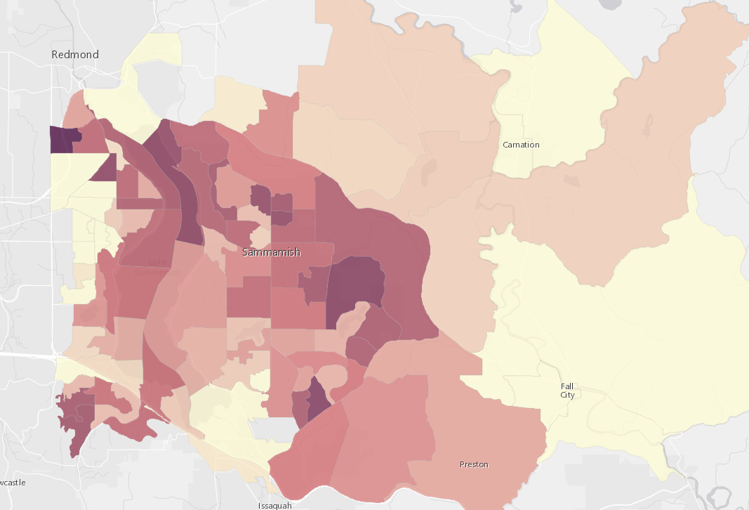 Suppose the user wants to explore the demographics of a subset of features, such as a neighborhood, but the features in the area of interest don’t have a common attribute for filtering. For example, when I select the attribute Population 25+ that earned a college degree, I notice that most of the adult population in the Sammamish, WA area seems to have a college degree.