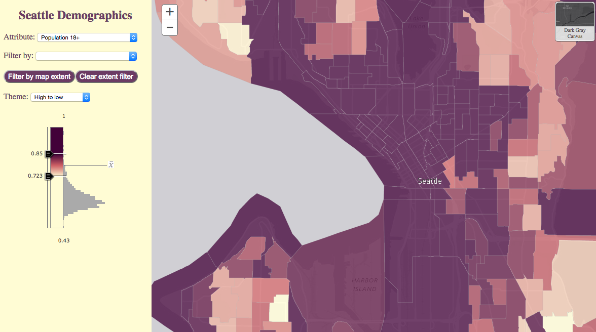 In the Seattle app, whenever the user decides to filter the features based on an attribute, the layer’s renderer is regenerated, exposing different spatial trends among the subset of selected features.