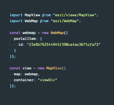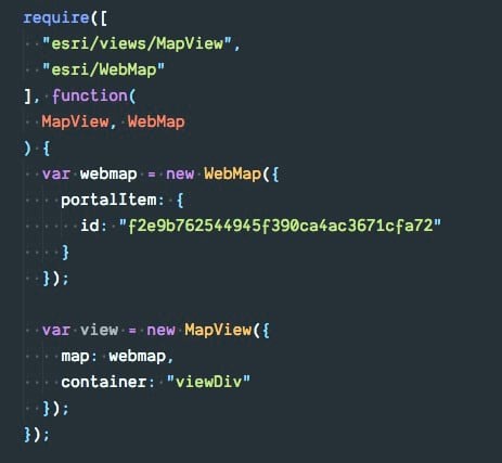Here is a small sample of a basic application written in JavaScript using the ArcGIS API for JavaScript. This may be familiar to many of you already building apps with the API. We use a require function to load modules of the API as needed.