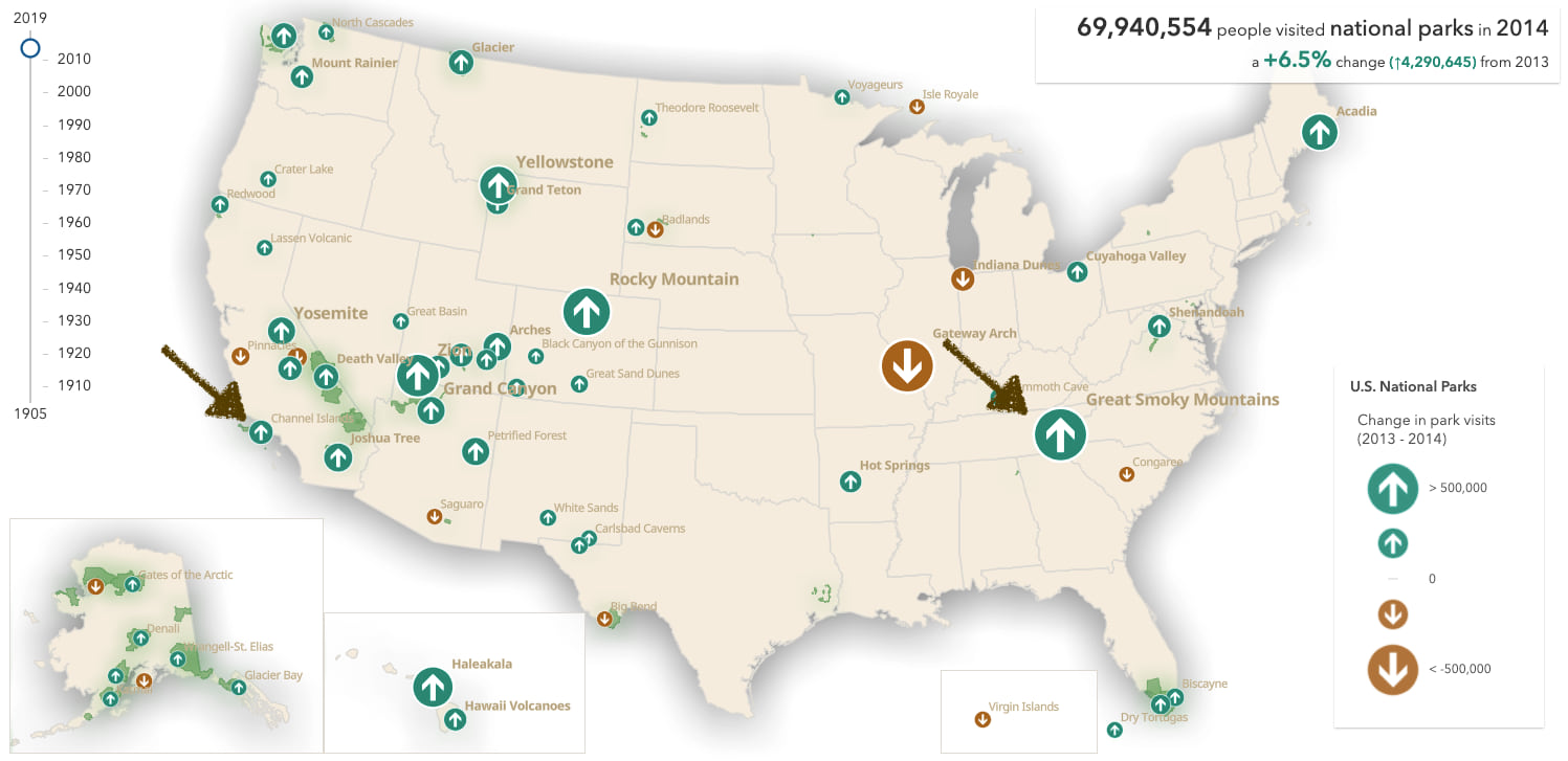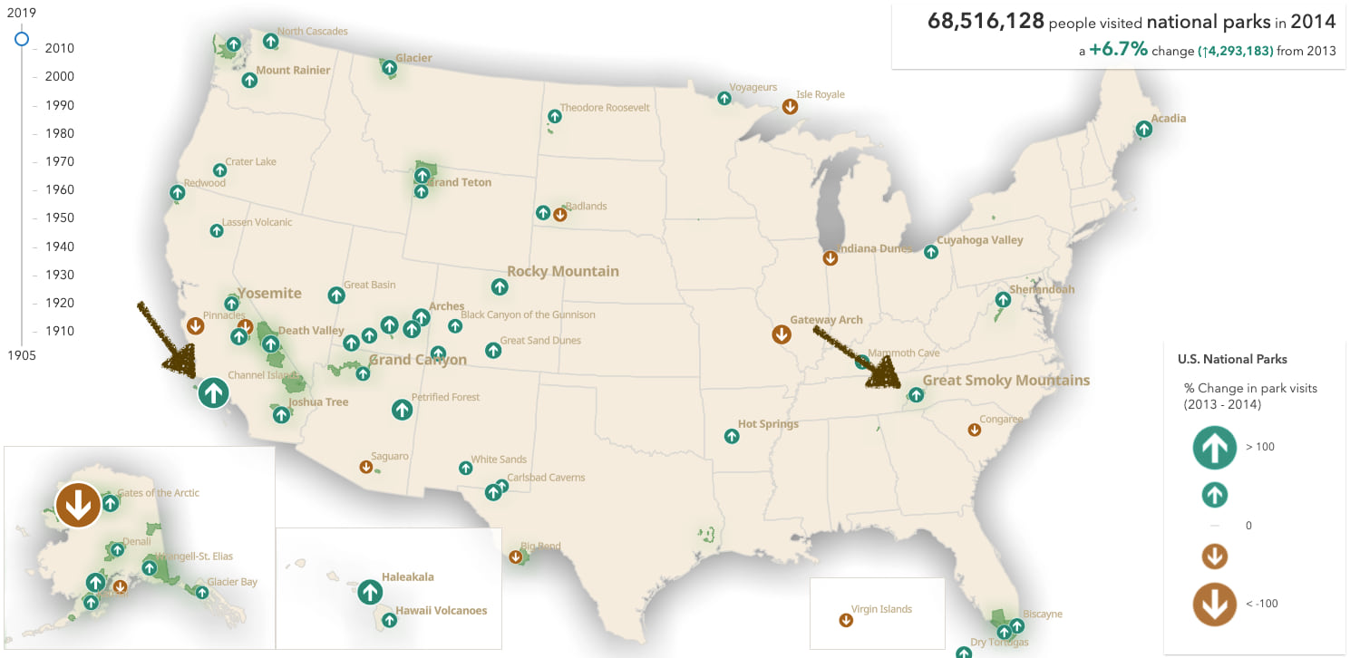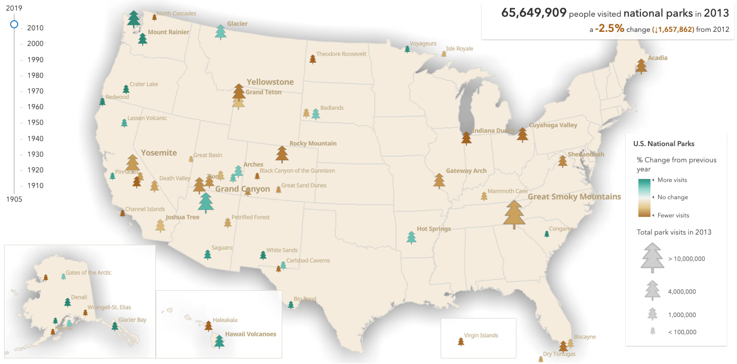The user can deduce the magnitude of the change relative to the total number of visits based on both of these variables. For example, in the following map of park visits in 2013, Great Smoky Mountains saw a moderate decrease in visitors, but was still the most visited park of the year.