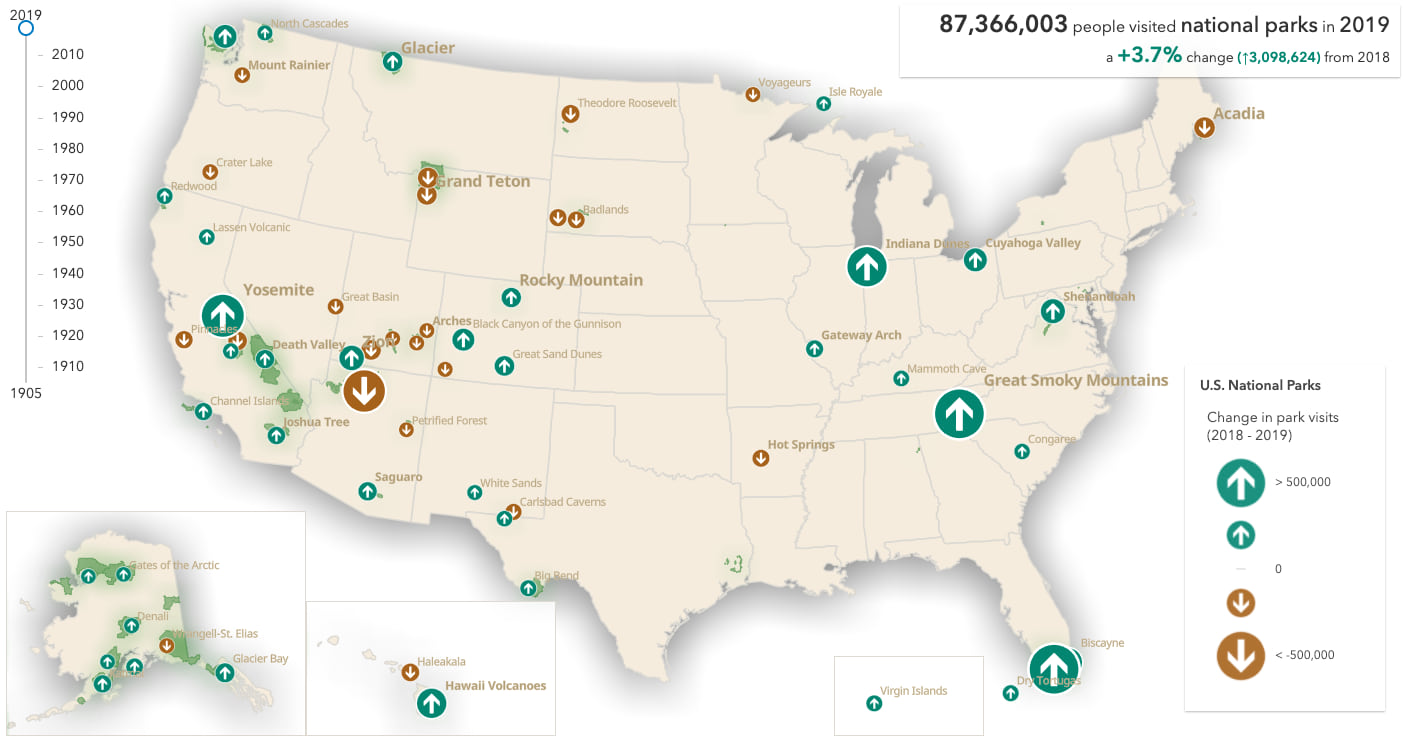 I created a series of apps to visualize how park visitation numbers changed over time from 1905-2019. In each of the examples, I added a slider to explore how park visits changed from year to year.