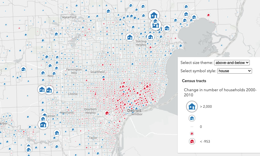 I choose different symbol pairs depending on the theme of my map. For example, I prefer the circle pair in the above-and-below household map because the hollow rings on the negative side of the ramp convey a feeling of emptiness, similar to how a neighborhood might feel if it experienced a significant decrease in population.