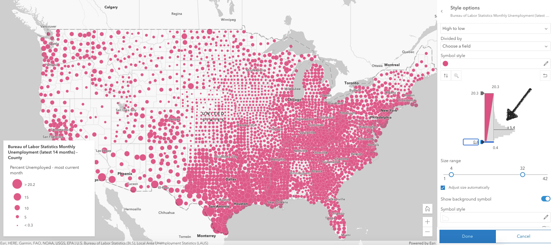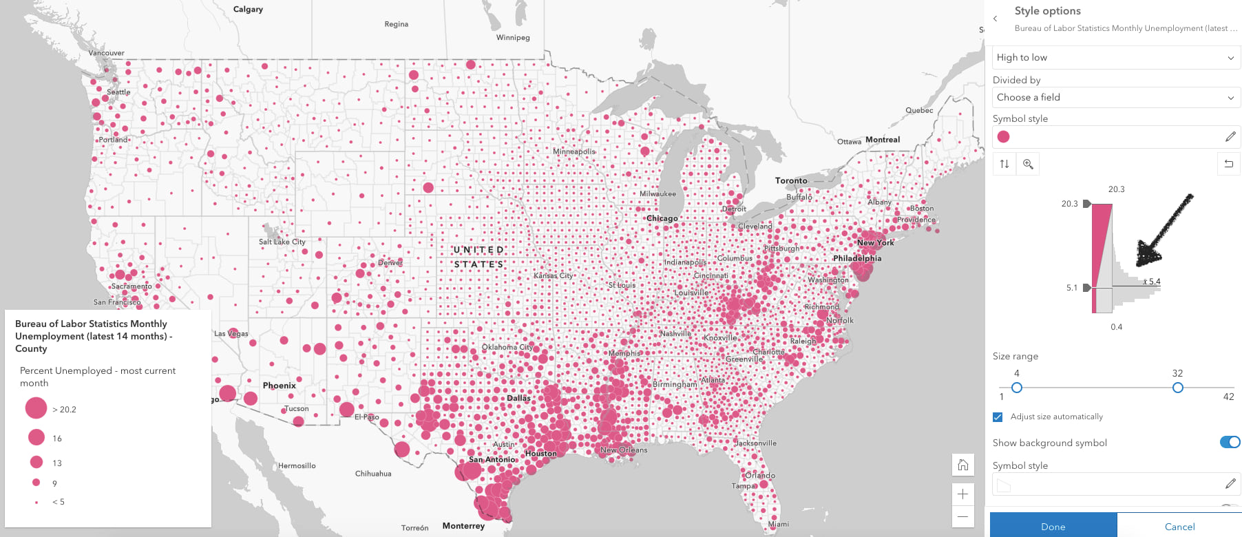 Size themes allow you to visualize above and below patterns effectively with size in a single layer. A symbol’s size can powerfully communicate the magnitude of a numeric variable unit-for-unit compared with all other data points in a layer. You can also use it to effectively communicate rates to indicate how significant a value is for each individual feature.