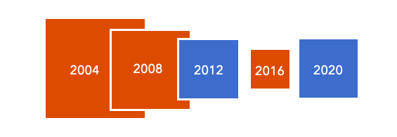 This map shows the results of the previous five U.S. presidential elections (i.e. 2004, 2008, 2012, 2016, and 2020). Each square represents the election winner for the given area. The right-most square represents the result of most recent election in 2020. Each square represents the winner of a single election for the given area; its size is proportional to the margin of victory for the winner. Smaller squares indicate a close election while larger squares show a larger margin of victory.