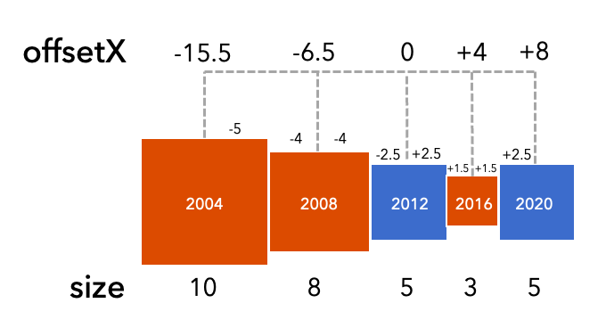 Note the middle symbol layer has an offsetX value of zero to keep it centered on the feature. Symbol layers representing the election winner before that year are offset by a negative number (the size of the symbol layer multiplied by the number of elections prior to the middle election). Symbol layers representing election winners after the middle election are offset with a positive number using the same logic.